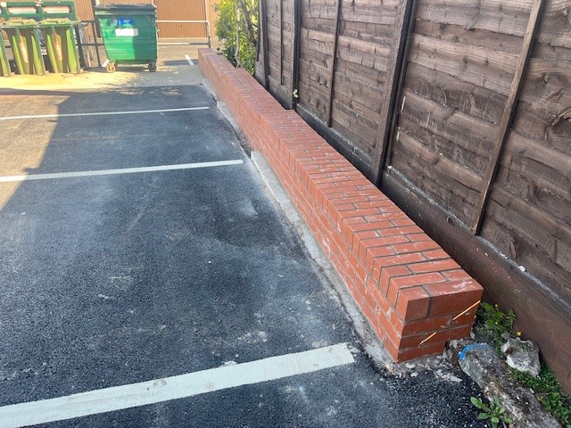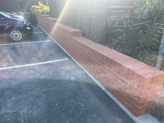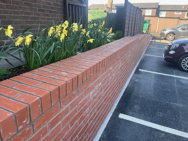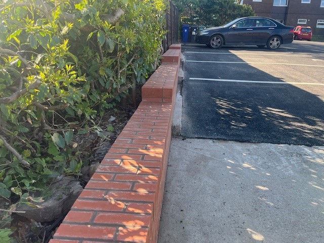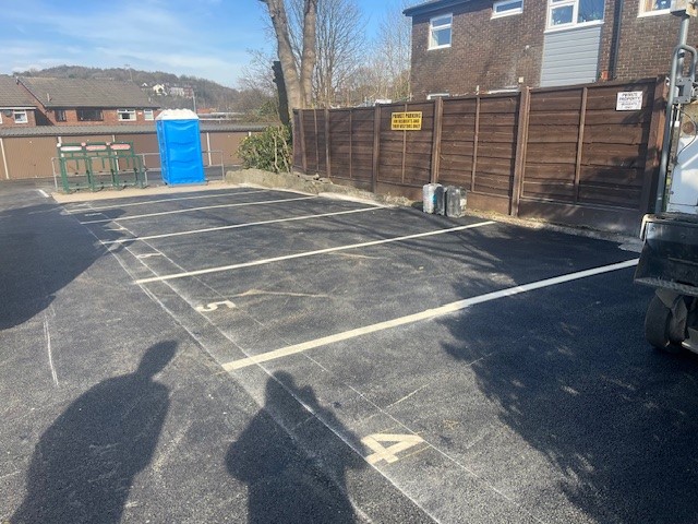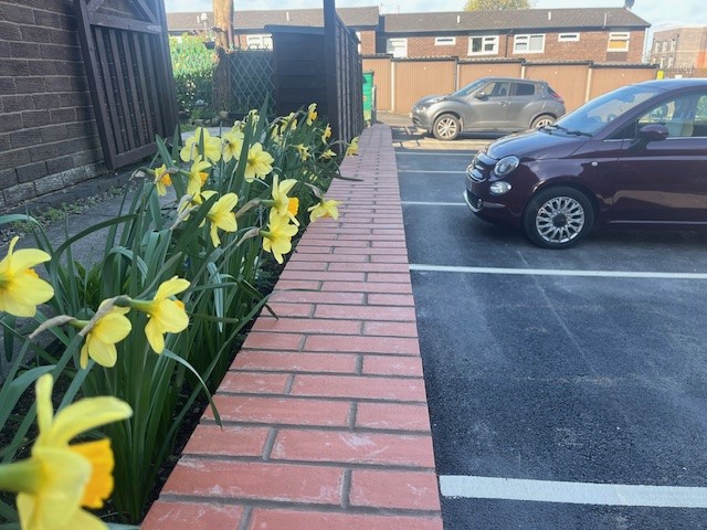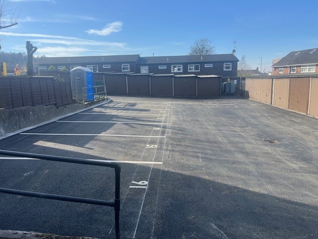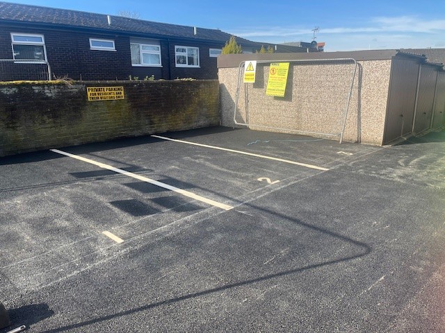 During March 2025 total resurfacing of the unadopted car park adjacent the garages was carried out by NMCC Civil Engineers Limited. This included rebuilding of a retaining wall, removal of a concrete stepped area, drainage, white lining and numbering.